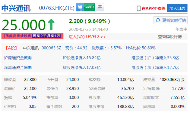 3月25日下午消息,中兴通讯今日股价大涨近10%,截至发稿,中兴通讯涨9.649%报25.00港元,港股市值188.88亿港元。