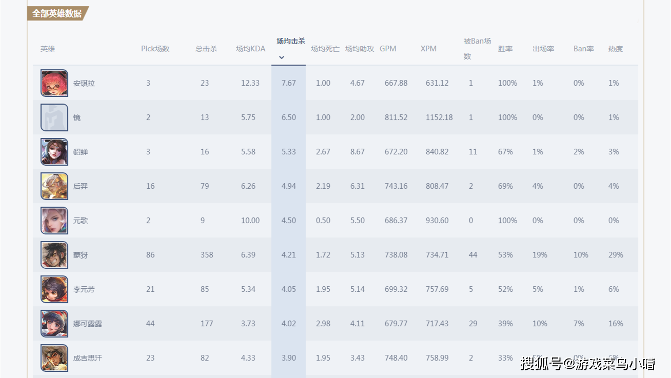 我们可以看到,安琪拉上场三次,但是场均KDA是第一,场均击杀数是第一,胜率是第一,这三个第一,相信大家可以明白他的厉害之处,虽然可能KPL安琪拉上场的时候,很多英雄都选不了 ,让安琪拉可以很好的发挥,但是,安琪拉这个英雄的强势,还是显而易见的,那么安琪拉在排位中的数据是怎样的呢?