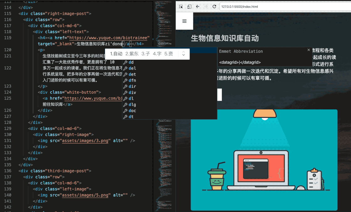 当输入任意内容后,如果有可以和输入匹配的 Emmet 缩写,相关建议就会实时展示出来供选择。