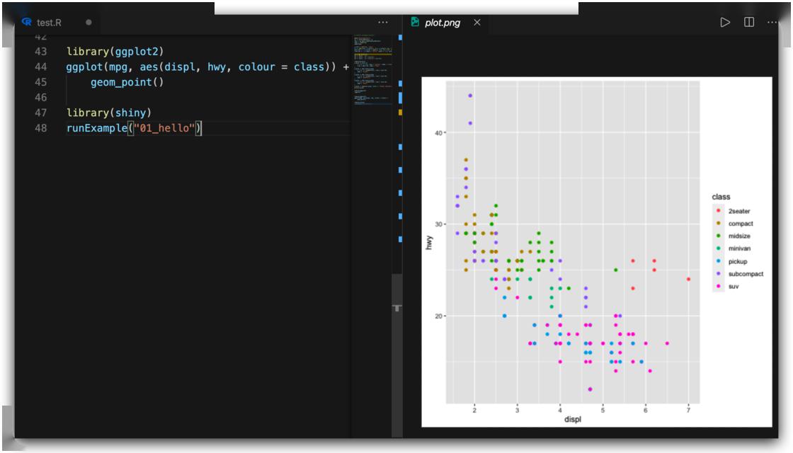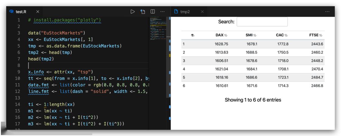 这个插件是 VS Code 中 R 的核心插件,具有语法高亮,基础代码片段和代码执行等功能。例如你可以在编辑器中选择某几行内容,然后使用 ctrl+enter 将代码发送到终端执行。
