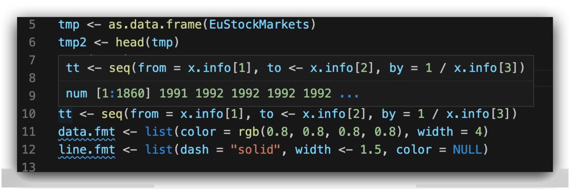 一些基本特性如鼠标悬停显示函数定义和帮助文档(无论包是否加载)、鼠标悬停在变量直接展示类型信息、自动高亮文档内所有同一变量和函数自动补全等都非常好用。