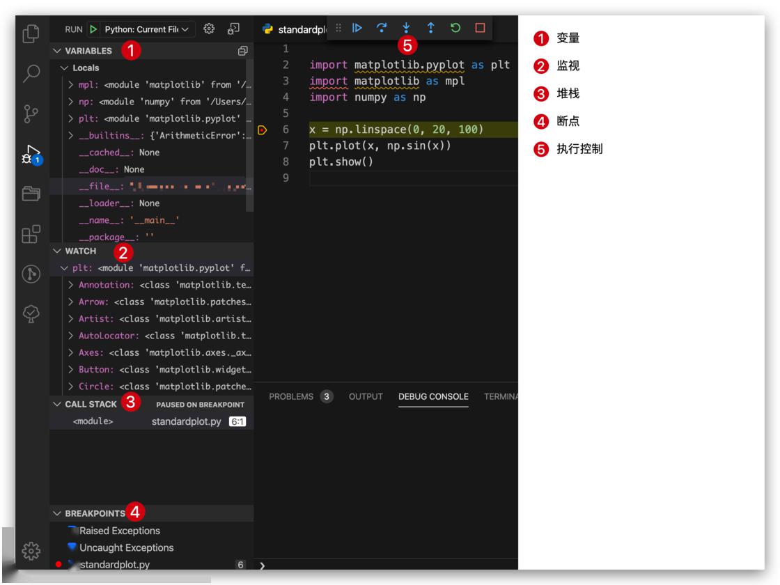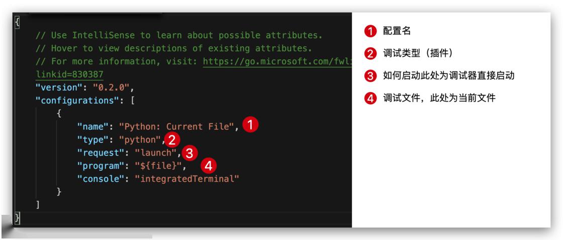 如果想进入调试模式,首先需要点击侧边栏的调制组件打开调试视图,会看到提示打开一个需要被调试的文件。我们以简单的 Python 脚本举例,打开脚本后会自动生成一个名为 launch.json 的调试配置文件。这个文件可以随时修改,定义不同的内容应该如何加载调试。典型的配置如下图所示。
