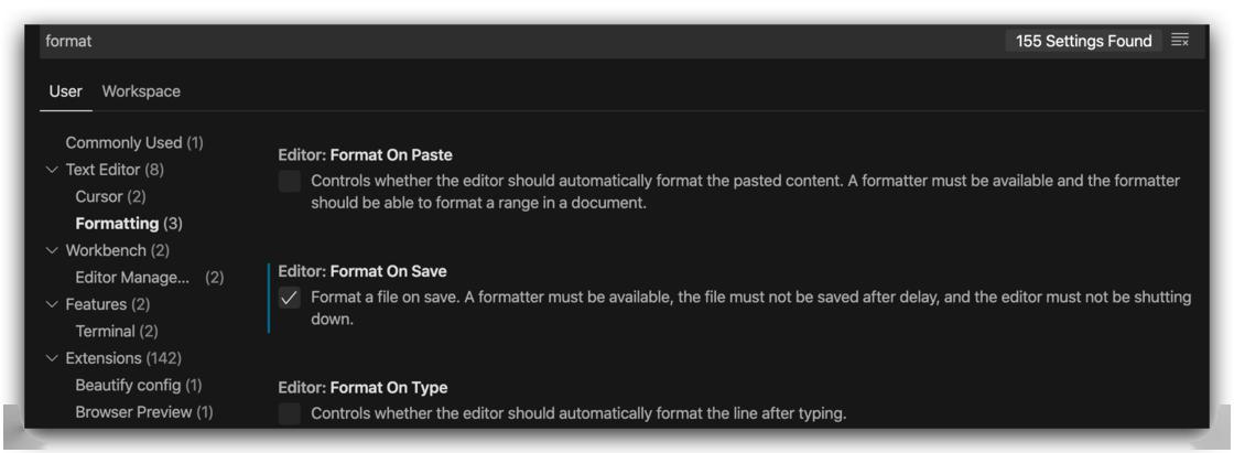 代码格式化是指让各种不规范的代码瞬间按照要求好看起来,VS Code 借助语言插件目前对绝大多数语言都有很好的支持。在设置中我们可以选择何时对代码进行格式化,包括输入粘贴和保存。此外每种语言都可以进一步进行个性化设置。