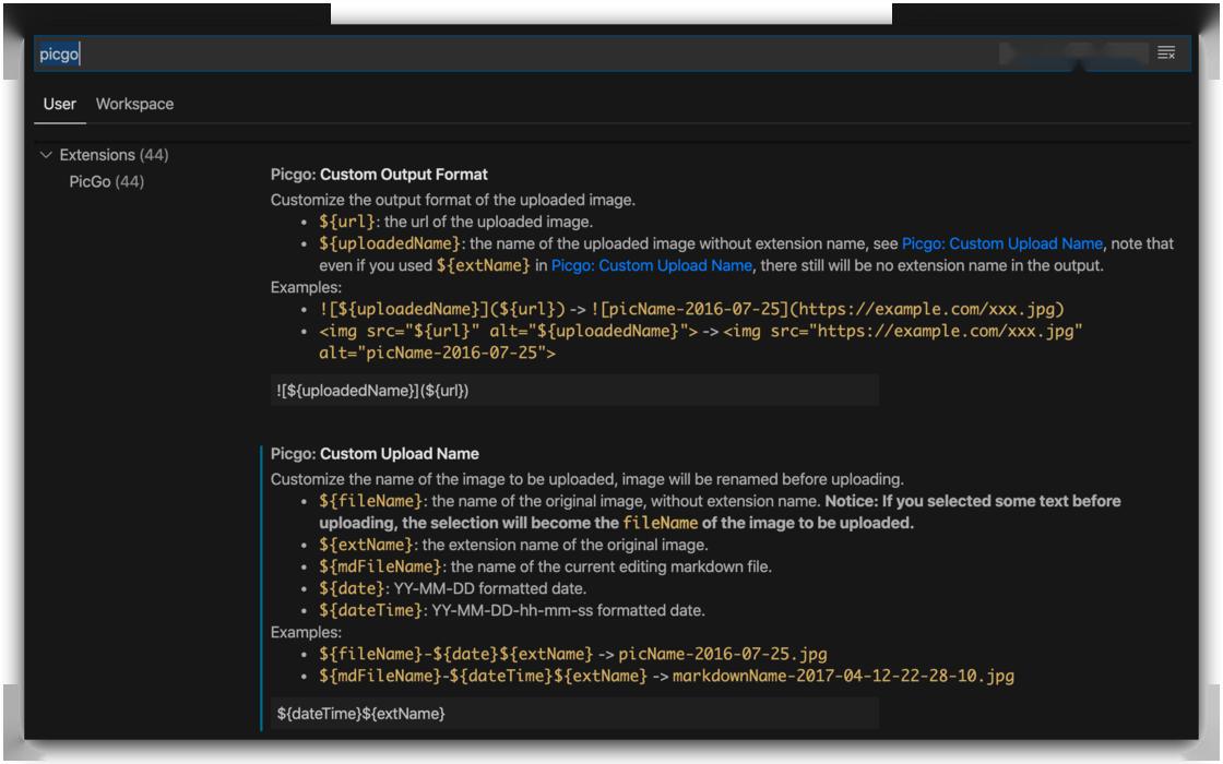 在设置面板中搜索 picgo 就可以看到相关的配置选项,需要的配置参数和 PicGo 客户端一致,例如使用腾讯云时需要填写 APPID、存储空间名和自定义域名等信息。因为平时使用的目录和文件名都可能包括中文,我设置为仅按照时间命名。