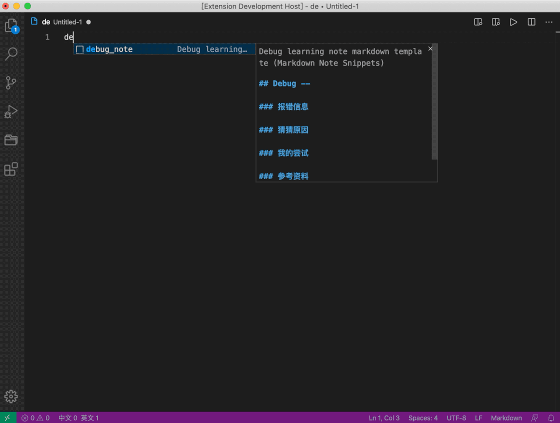 我把自己一些常用的 Markdown 模板做成代码片段并打包成了一个 插件。例如当我输入debug的时候就可以方便的调用 debug 记录模板。