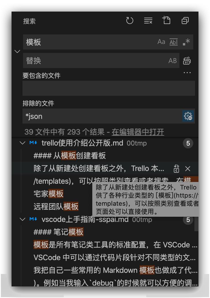 如下图所示,我在一个文件夹内搜索「模板」,它会在结果中显示每个文档中的搜索结果,鼠标放在某一行时会用浮窗形式展示详细内容,点击后会直接打开对应文档并定位在所在行。
