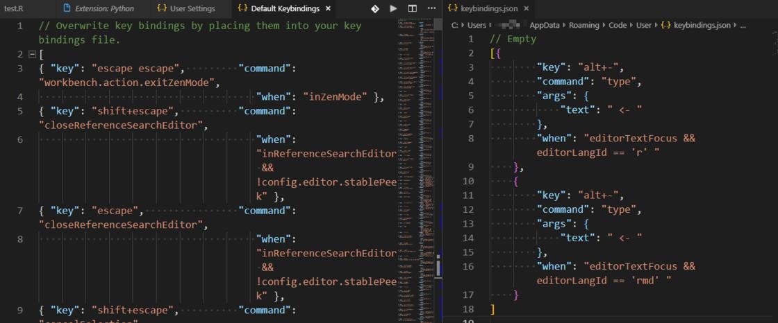 例如 R 语言用户在 RStudio 中可以使用 alt+- 一气呵成输入赋值符号 <-,在 VS Code 中必须也可以。