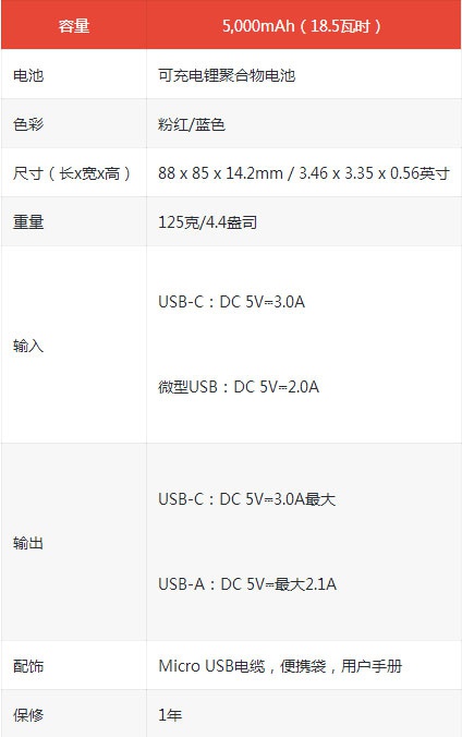 T5000C的规格为88 x 85 x 14.2mm,重量为125克。同时,这款移动电源拥有5000mAh的电量,T5000C设有两个USB端口(Type-A和Type-C),输出电流高达3.0A,这让用户可以同时为两个设备充电。此外,T5000C的Type-C端口支持双向充电,仅用一根线缆就可以为设备充电或者为T5000C自身充电。
