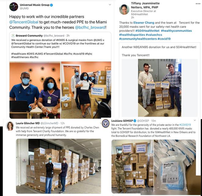 在美国,处于疫情风暴中心的纽约长老会医院和康奈尔医疗中心已收到腾讯援助的75000只N95口罩和50台呼吸机。加州帕洛阿托的斯坦福医院是美国顶级医院之一,也是首批开展新型冠状病毒诊断检测的医院。目前,腾讯捐赠的口罩和防护服已运达斯坦福医院。同时,腾讯联合美国环球音乐集团向纳什维尔、迈阿密等州内医院和社区捐赠的医疗物资正在陆续不断送往当地。