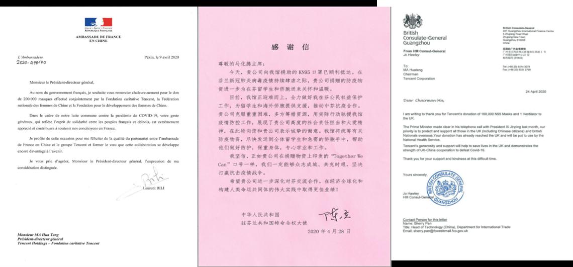 “五一”期间,对于腾讯捐赠英国的口罩与呼吸机,英国驻广州总领事贺颂雅在感谢信中表示,腾讯的慷慨支持将实质性地帮助到英国,并加深了中英共同抗击疫情的紧密合作。