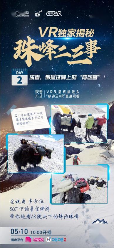 此外,中国移动咪咕还携手登山名家黄春贵在咪咕圈圈、咪咕视频、咪咕阅读、咪咕音乐等平台同步上线了《阿贵的珠峰日记》直播与VLOG内容,开启了全球首次5G攀珠峰云直播。“阿贵”作为国家登山队队员、国内首位完成“7+2”探险计划(七大洲最高峰攀登及南北极徒步探险)的80后运动员、北京奥运珠峰火炬传递手,此次带队登珠峰,通过5G直播+VLOG的形式记录登峰全过程,让广大网友全方位了解攀珠峰背后的人与事。在近几期的云直播中,阿贵为观众“揭秘”了登山者在珠峰大本营的饮食起居情况,珠峰云吃火锅局更是引得网友一片惊叹。与此同时,移动云VR、咪咕视频还上线了《VR攀登者》栏目,带领观众趣看VR视角下的鲜活珠峰。