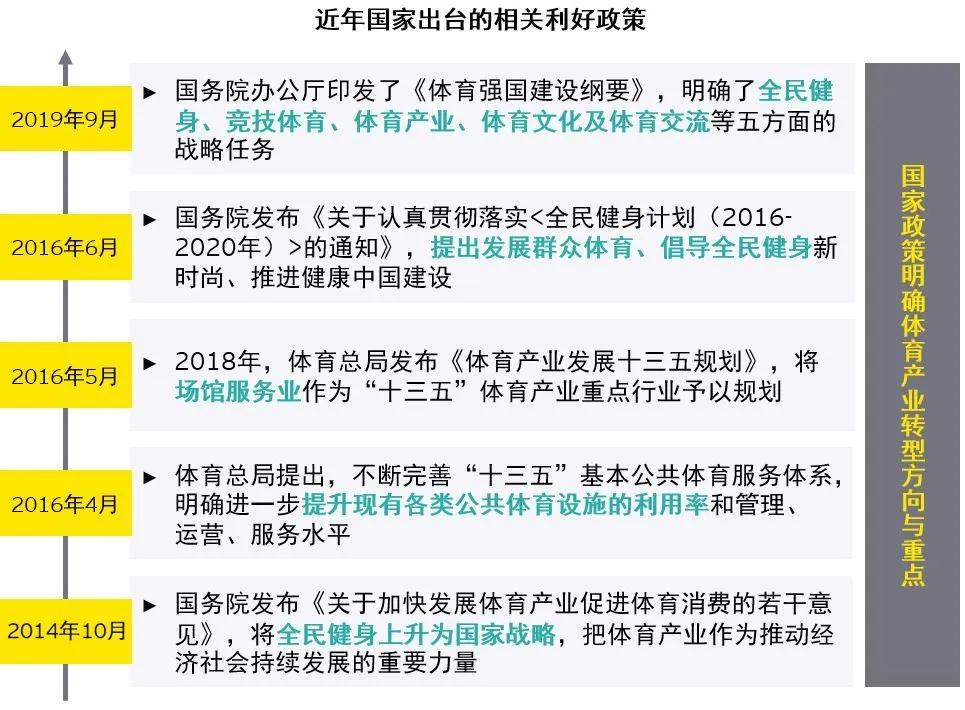 宏观政策上,随着国家整体经济的发展,中国体育行业自2014年开始步入高速成长变革的快车道。2014年10月20日,国务院下发了46号文件《关于加快发展体育产业促进体育消费的若干意见》,把体育产业作为绿色产业、朝阳产业培育扶持,并预计到2025年体育产业总规模将超过5万亿元。2016年12月,发改委、体育总局印发《“十三五”公共体育普及工程实施方案》,提出到2020年,人均体育场地面积达到1.8平方米,2025年将人均体育场地面积提升到2平米。政策性的引导,进一步拉动了“全民健身”和场馆向公众开放的热潮。