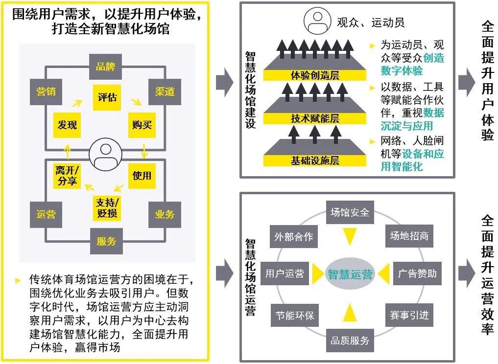 因此,基于场馆定位的变化,未来智慧化的体育场馆对外要以当下和未来的用户需求为中心,考虑更多元的应用场景,设计满足用户需求的服务与产品以吸引用户,进一步“开源”;对内则要通过场馆智慧化规划和智慧化运营,降低建筑能耗,提升运营效率,达到有效“节流”。