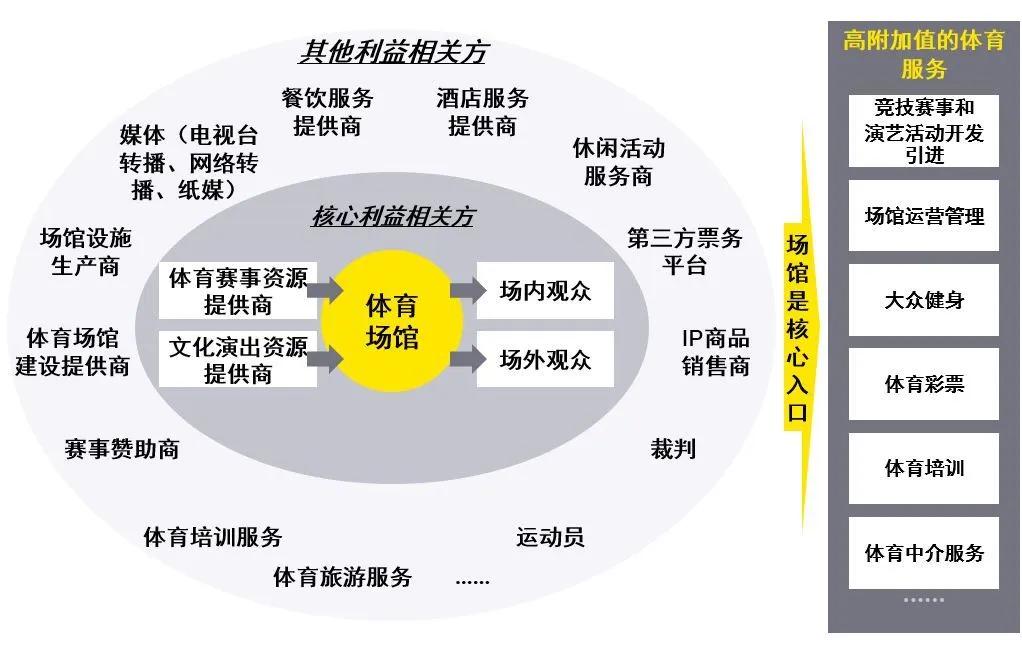 在整个产业链条中,场馆的核心利益相关方包括赛事、文化演出的资源提供商,以及场内与场外观众消费者。其他利益相关方包括媒体、餐饮、酒店、票务、特许商品销售等多类服务提供方。传统的产业链条中,场馆更多是以被动者的姿态出现,完成服务赛事的工作任务。
