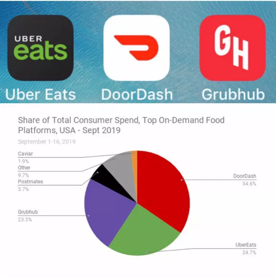 根据研究机构Edison Trends(爱迪生趋势)去年9月对全美140万宗外卖交易的分析,DoorDash在市场份额竞争中(按消费者支出计算)遥遥领先;Uber Eats以1.2%的微弱优势击败了前领导者Grubhub;三大巨头加起来占美国外卖市场82.8%份额。