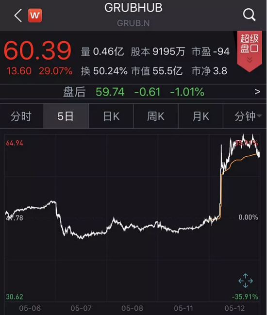 截止美股收盘,GrubHub当日上涨29.07%至60.39美元/股,最新总市值达55.53亿美元。