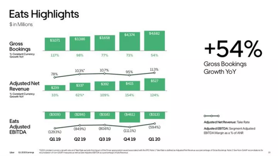 但疫情也意外给外卖行业带来新的商机。今年一季度,优步大力发展的外卖业务的增长势头强劲。优食(Uber Eats)外卖订单额46.8亿美元,收入同比增长54%至8.2亿美元,净营收年比年同比增长124%,佣金率提升至11.3%。