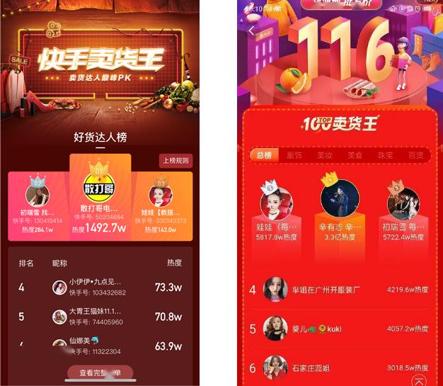 再举一个例子:116快手带货王,以直播 + 电商的模式,通过快手入驻的主播,进行在线带货。通过买卖产生的交易额和个人直播间的热度,进行排名。