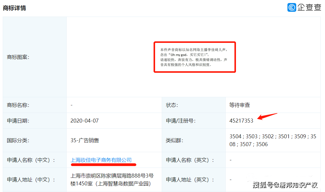 企查查数据显示,今年4月7日,由李佳琦持股49%的上海妆佳电子商务有限公司(以下简称上海妆佳商务公司)申请注册了一枚“oh my god,买它买它!”声音商标。这枚声音商标的注册类别为第35类,目前正处于“待审”状态。据了解,上海妆佳商务公司成立于2019年3月,李佳琦为第二大股东,持股比例49%,位列最终受益人。