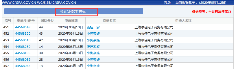 这457件商标的申请时间均集中在2020年3月13日到2020年4月7日这段时间。这意味着,在不到一个月的时间内,上海妆佳商务公司先后申请注册了近500件商标。