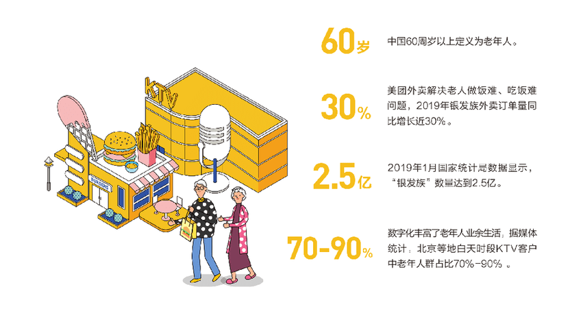 点外卖、团购唱K、手机上订电影票……这些时尚的消费方式正得到越来越多老年人青睐。报告显示,2019年,全国60岁及以上老年群体的外卖订单量同比增长近30%。根据媒体对北京、武汉多家KTV的调研数据显示,KTV白天消费客户中老年人群占70%到90%,年龄主要集中在50-70岁。通过美团平台,老年人开始享受一种特别的“时尚生活”。