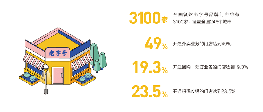 报告指出,美团通过提供营销、配送、IT、供应链、经营及金融等6大服务,打通商户从原材料采购、生产、门店管理等各个环节,实现对餐饮业经营全链路的覆盖。报告显示,2019年,全国3100家餐饮老字号门店中,约有49%开通了美团外卖业务,19.3%开通团购、预订业务,23.5%开通扫码收银。