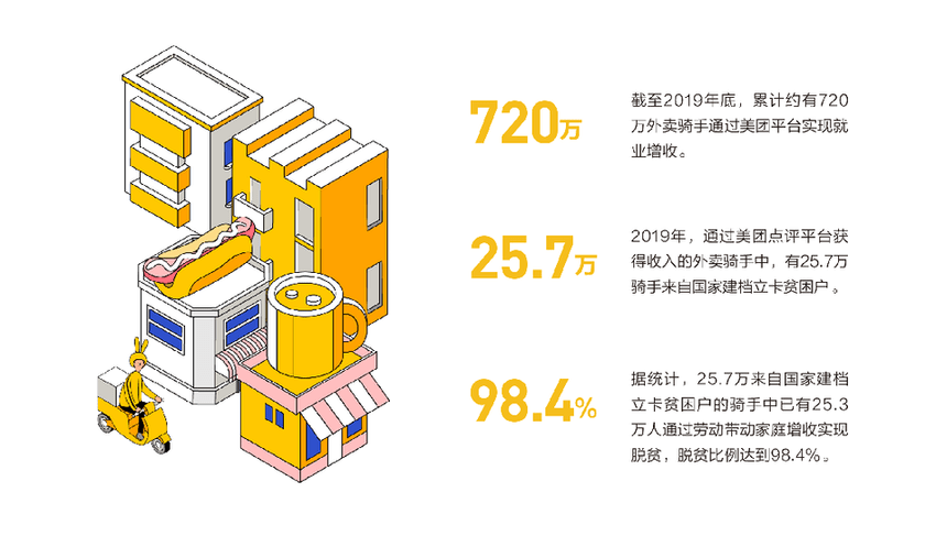 就业是最大的扶贫。报告指出,2019年,通过美团平台获得收入的外卖骑手中,有25.7万骑手来自国家建档立卡贫困户。其中,有25.3万人实现脱贫,脱贫比例高达98.4%。美团还积极探索公益扶贫、美食消费扶贫、旅游扶贫等模式,多措并举助力脱贫攻坚。