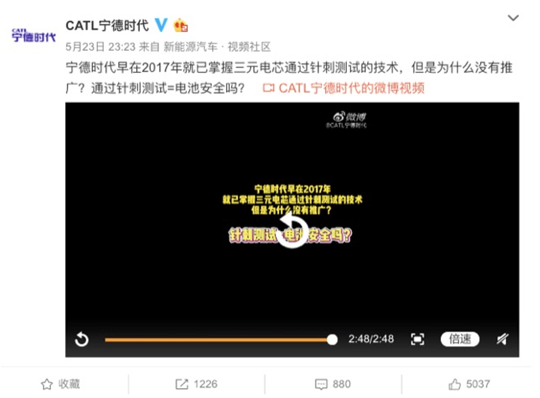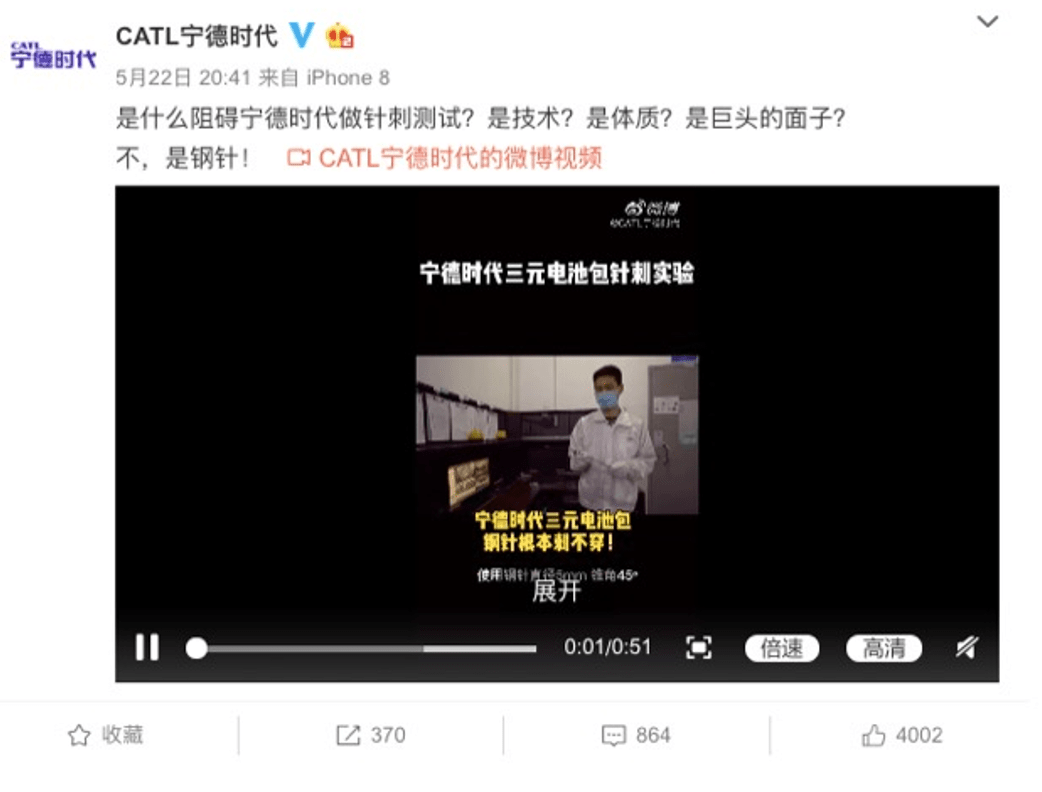 为了回应质疑, 5月23日宁德时代发布第二支针刺测试视频,与比亚迪早前针刺测试的公开透明不同,宁德时代的针刺测试无论清晰度及摄像头视角,都非常模糊,有点“犹抱琵琶半遮面”。钢针究竟有无刺穿电池单体,是“贯穿针刺”还是“表皮针灸”?都看不清楚,民众强烈要求宁德时代再一次站出来直面澄清,若是“作弊”、“偷换概念”,再一次欺骗群众的感情,无疑将会招致宁德时代品牌的信誉扫地。