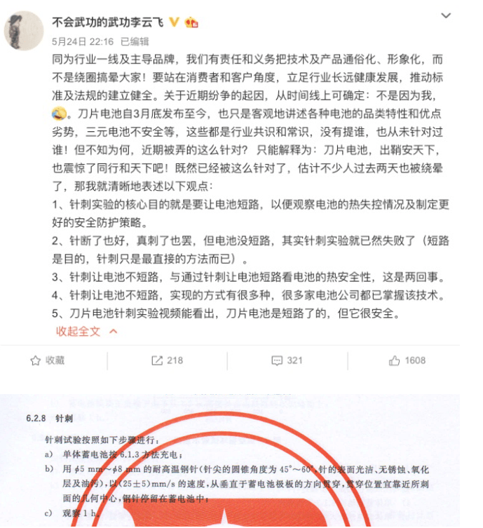 关于电池的针刺试验,国家有明确的标准要求,重点是:“钢针必须贯穿!”就像比亚迪销售公司副总经理李云飞说的那样:“针刺试验的核心目的就是要让电池短路,以便观察电池的热失控情况及制定更好的安全防护策略。”“针刺让电池不短路,与通过针刺让电池短路看电池的热安全性,这是两回事。”