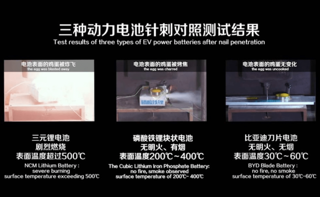 在这场针刺试验中消费者还发现,在同时进行针刺试验的三种动力电池中,三元锂电池被针刺之后,剧烈燃烧,表面温度超过500摄氏度,电池表面的鸡蛋被炸飞;磷酸铁锂电池无明火,有烟,表面温度200-400摄氏度,电池表面的鸡蛋被烤焦;刀片电池无明火,无烟,表面温度30-60摄氏度,电池表面的鸡蛋无变化。
