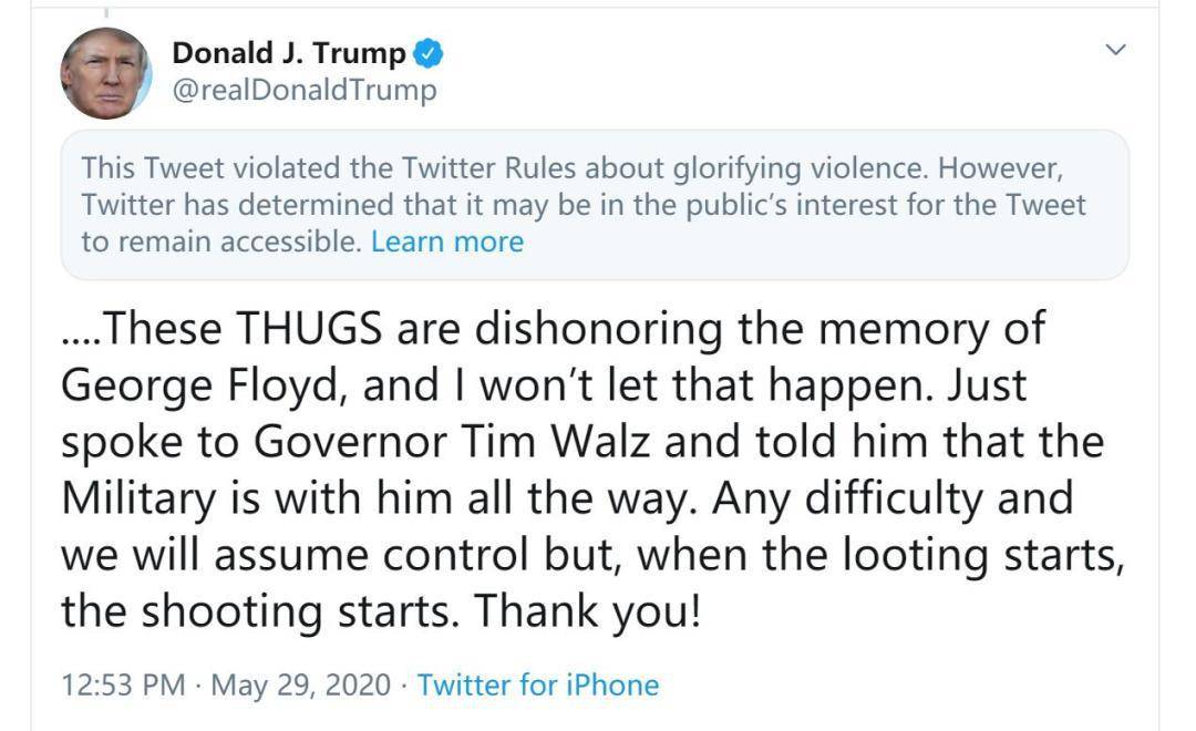 这条推文实际连着上一条:“我不能袖手旁观,眼睁睁地看着明尼阿波利斯这座伟大的美国城市发生这样的事情。完全缺乏领导力。要么是非常软弱的激进左翼市长雅各布·弗雷采取有效行动让这座城市得到控制,要么我会派遣国民警卫队,把事情做好。”不过这则推文并没有被判定为违反推特平台规则。