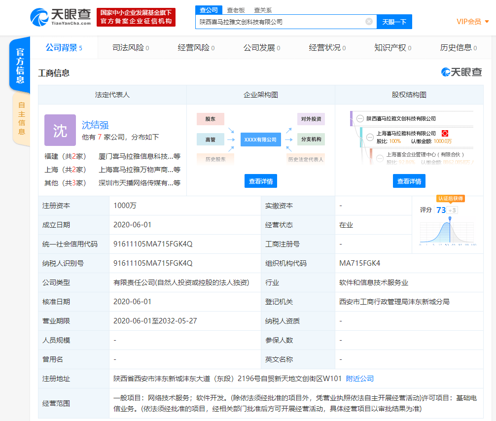 【环球网综合报道】天眼查数据显示,6月1日,陕西喜马拉雅文创科技有限公司成立,注册资本1000万,法定代表人为沈结强,公司经营范围包括一般项目:网络技术服务;软件开发;许可项目:基础电信业务。该公司由上海喜马拉雅科技有限公司全资持股。