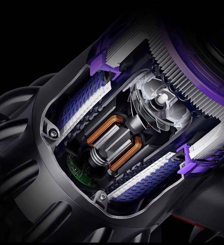 产品的体验并非由单一的核心技术决定,而是多个技术协同合作达成。比如上面所提到的气旋技术,便是由戴森数码马达和电池技术提供强劲的能量,再通过合理的吸力以及气旋能耗配比,最终在保证吸力的同时,不损失气旋分离器的分离能力。