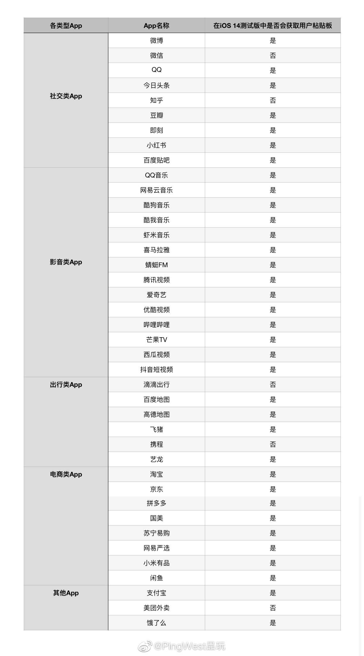 据科技媒体品玩测评发现,在iOS 14开发者测试版中,国内常用的40款App中,包括QQ、微博、网易云音乐、淘宝等35款App均会获取用户的剪切板。
