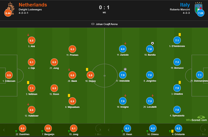 评分方面,因莫比莱和基耶利尼以7.9的评分共同收获全场比赛最高评分,打进一球的巴雷拉紧随其后;荷兰队方面,后卫维尔特曼收获全队最高评分。