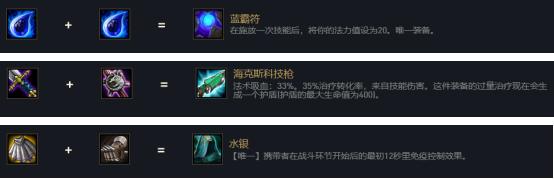 蓝BUFF是锐雯的核心装备,锐雯配上蓝BUFF,就是无限释放技能的永动机。无限给自身加护盾,无限地打出AOE伤害。科技枪可以帮助锐雯强化续航能力,若是被集火的一瞬间护盾被打掉,科技枪可以及时将血补回来。锐雯作为无限释放技能的永动机角色,最怕的就是敌人的控制技,为了防止被控住一套秒,水银至关重要。