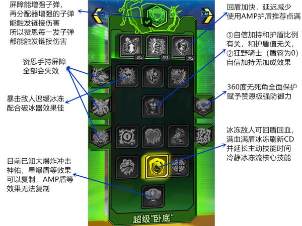 通过冰冻敌人,触发冷静收集,在满血满盾时能瞬间刷新CD或加满主动技能持续时间使屏障和小飞机无限使用。