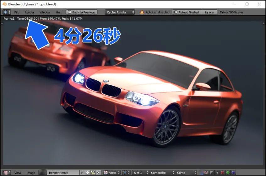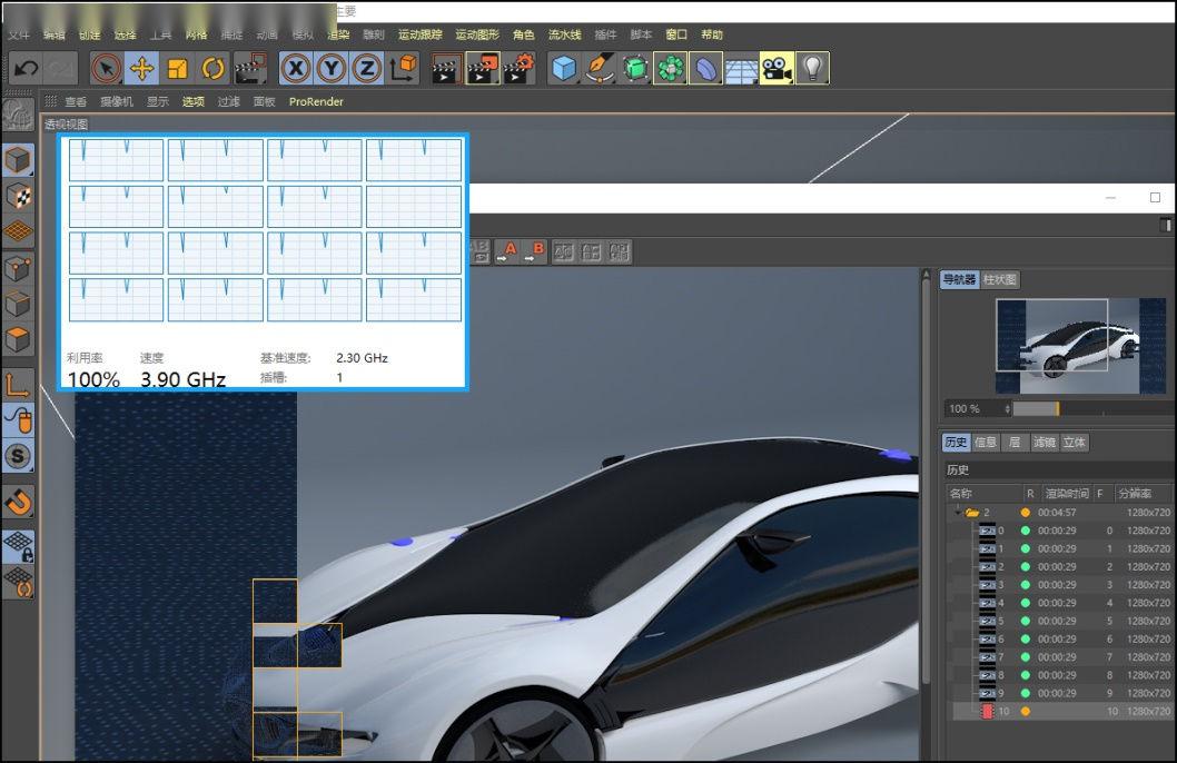 Cinema 4D 是目前流行的三维建模和渲染软件,在产品设计、电商平台(渲染)效果图、广告视频等领域常见。而它也正是Cinebench 测试的“原型”。大家知道,渲染,也是最吃硬件资源和最耗时的应用。在一个50 帧的汽车动画渲染中,i7 10875H 再度以全核3.9GHz/110W 封装功率跑完渲染过程,单帧耗时29 秒~30 秒,总耗时1522 秒(25 分22 秒)。