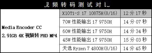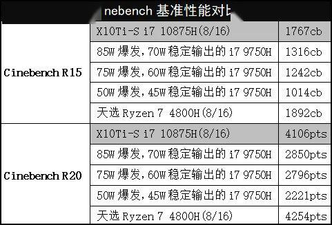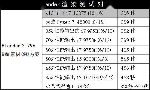 ▲通过这个表,你能发现X10Ti-S 的i7 10875H 在C4D 项目中的效率简直叫疯狂,相较于70W 稳定输出的i7 9750H ,耗时缩短了15 分钟左右;相较于45W 稳定输出的i7 9750H ,耗时缩短近一半!更有趣的是,i7 10875H 在Cinebench 环节略微落后于Ryzen 7 4800H ,但在同源的C4D 应用环节却“翻盘”了,有2 分13 秒的优势!