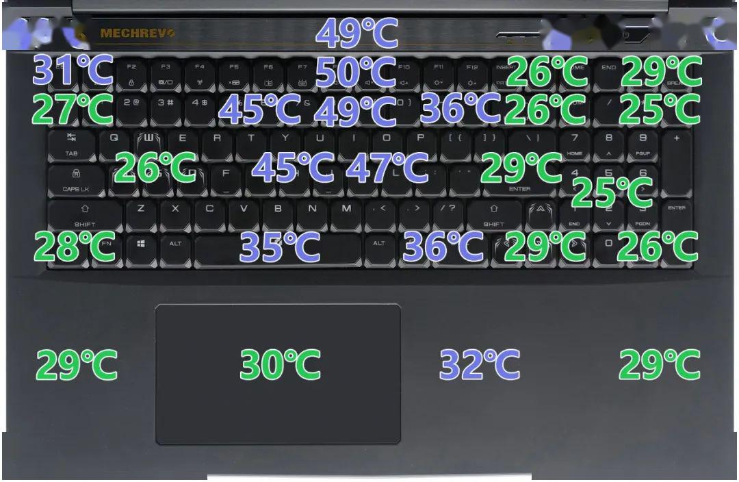 X10Ti-S的内部结构和X9Ti-R相同,所以它们俩的散热及热量分布也一致:高温区域主要在C面的中间,包括中部和中上部,但最高也就50℃,由于采用了磨砂亲肤工艺,还能上手。而键盘操控区的左侧和右侧非常凉爽,请注意是“凉爽”——哪怕在考机48分钟后,你把手靠近键盘左侧区域,会感觉到凉风(没开玩笑),而这个区域的温度不到30℃,WASD键更是只有26℃——是的,大幅低于人手的正常温度,是凉的!而键盘右侧区域温度也不到30℃。