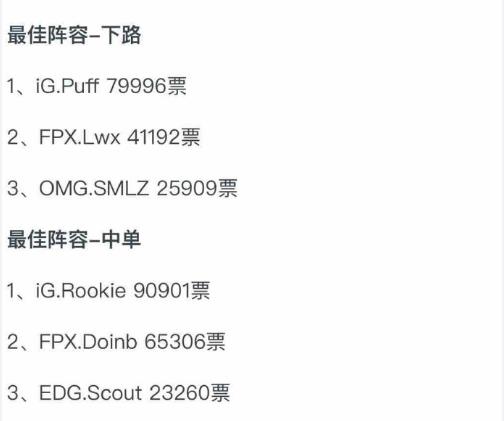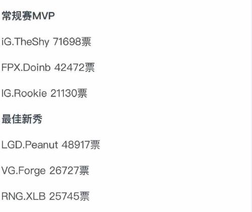 另外最佳新秀这一块,票数最高的是LGD打野peanut,第二名是VG中单蕉太狼,第三名是RNG打野小龙堡。