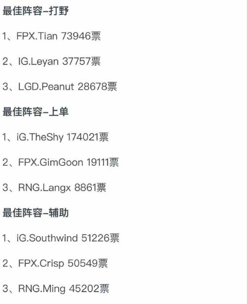 之后就是大家非常关注的最佳阵容,观众票选的结果如下图所示,除了最佳打野票数最高的是FPX打野Tian之外,其他四个位置全部都是IG队员第一。而最佳打野这个位置,第二名也是IG的乐言。另外最佳上单theshy票数第一不意外,意外的是也太多人投他了吧,直接有17W的投票,这应该是目前所有投票中,票数最多的一个,可见theshy的技术和实力还是得到了相当大一批观众的认可。