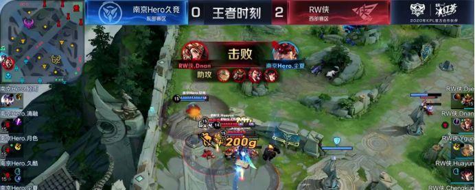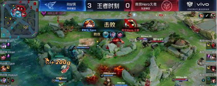 HERO这局比赛可以算是全联盟最拉垮的一场比赛,从阵容方面来看是绝对优势的,而且孙尚香已经发育成型,但是仍然在二十分钟团战的时候,被RW侠镜强势突后二连击破,而且狄仁杰也极限输出击杀孙尚香,RW侠二换五直接团灭对手拿下比赛,这种优势阵容都能输掉比赛解说也十分气愤,都说出了“拜个早年”这种气话,为HERO的不争气发愁。