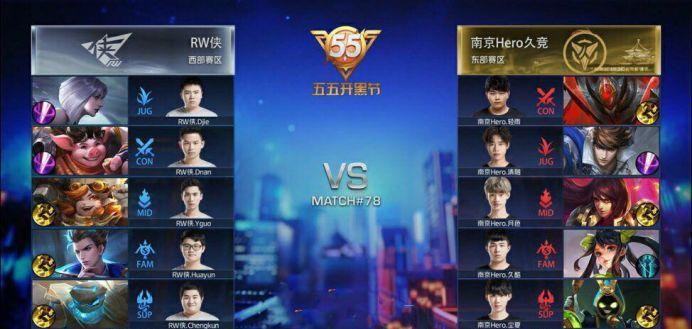 开局双方互换资源,HERO娜可露露连续两次支援边路拿下两个双杀, 前期打开局面;但RW侠主动开团,赵云连斩三人拿下黑暗暴君扳回局面,而且RW侠河道抓住机会,团战一换四推上高地;决胜团中,RW侠五人抱团上路出击,Yguo的嫦娥给到控制先定射手再定法师,教科书式的展现了嫦娥的控制链,同时马可波罗配合伤害打满,拿下本局比赛。