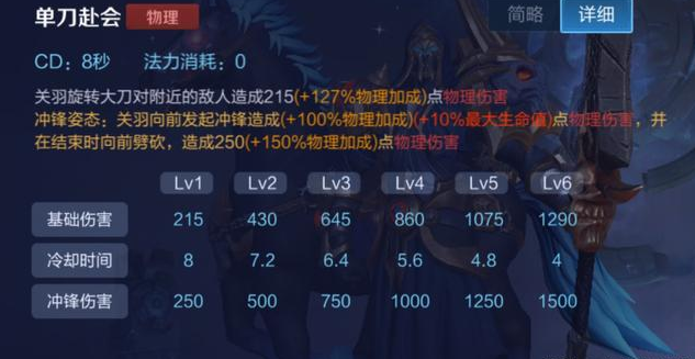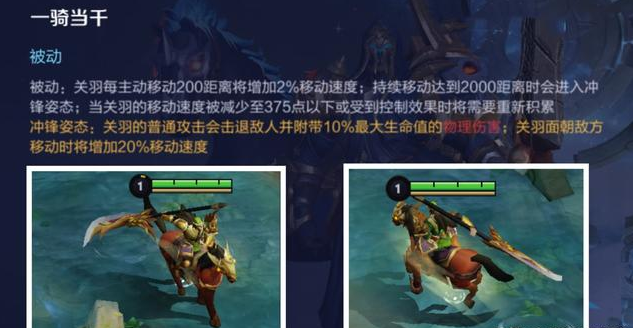 关羽的被动技能名为“一骑当千”,其主要的作用便是通过移动提高自身移速,并在移速达到一定距离之后,进入到“冲锋姿态”,在此姿态之下,关羽的普攻将会打出击退效果,并在命中敌方英雄附带出10%的最大生命值。