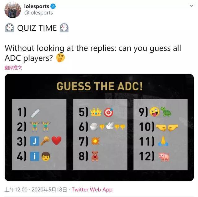 前言:LOL这款游戏能够经久不衰,除了优秀的游戏设计、好玩有趣的游戏机制之外,更重要的一点是非常成功的电竞产业。因为电竞产业的迅速发展,使得LOL拥有了众多高黏性用户。而电竞行业的发展也给职业选手和LOL带来了更多的流量和故事,一些选手们的事情也被粉丝和吃瓜群众们津津乐道,外号和调侃更是不少。然而玩家玩梗也就是图一乐,真玩梗还得看官方。就在5月18号的早上,LOL官推更新了一个动态,让大家根据emoji来猜测各赛区的LOL选手。