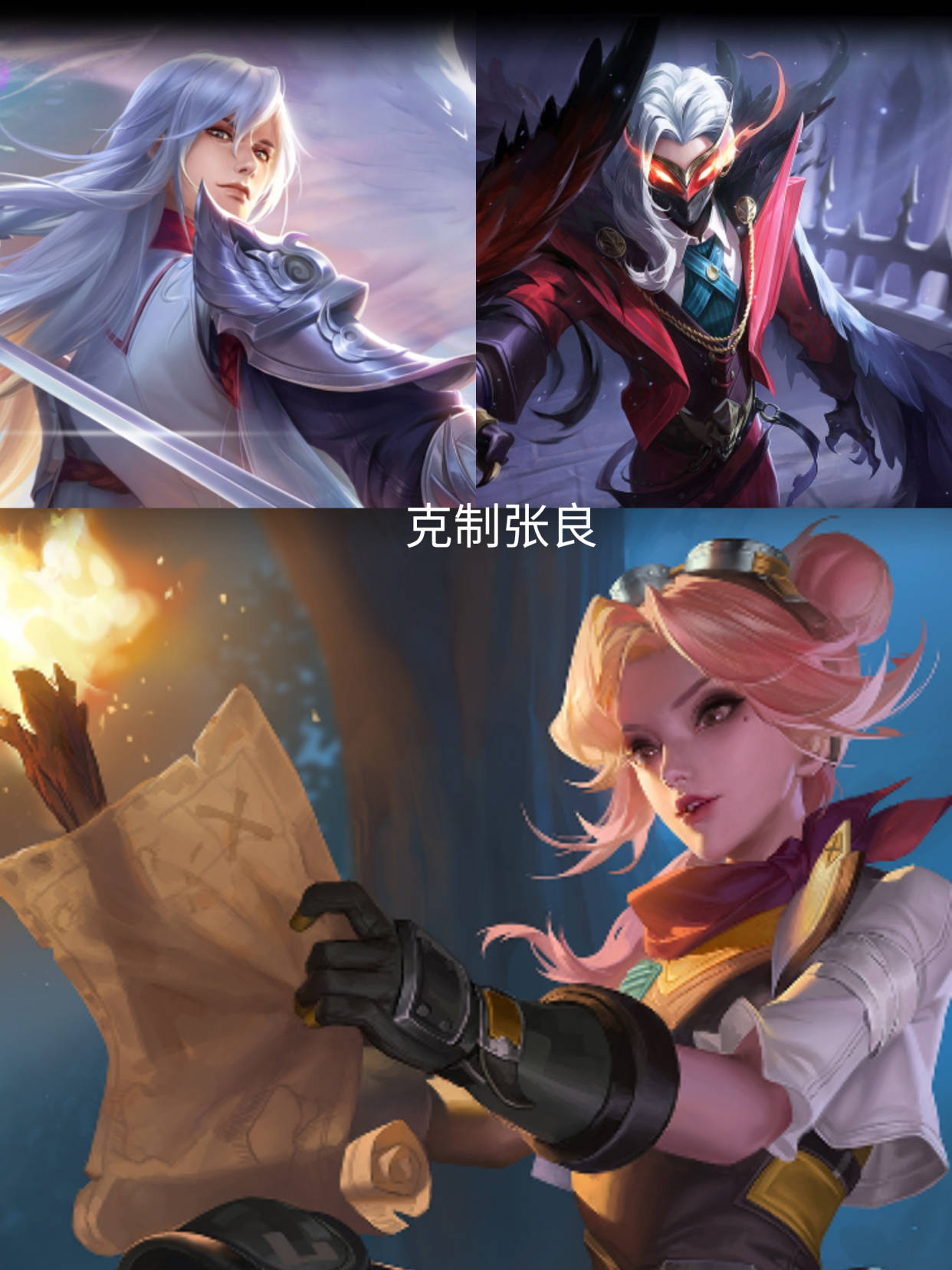 李白:首先李白有一个非常好玩的,一个玩法就是借野怪刷被动,然后一一过来二技能三技能给你来一套,基本上就残了,有可能给你秒了,因为张良皮相对来说,比别的法师还要脆一点,所以说张良比较害怕李白。李白二技能是无敌,三技能也是无敌,一技能可以瞬间回去,张良就算想衔接控制,控也是一个远距离挣脱浪费个三技能划不来
