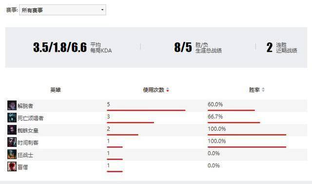 他比赛使用塞拉斯比较多,再就是死歌和蜘蛛。但是排位使用比较多的是艾克和塞拉斯,排位胜率在68%左右。