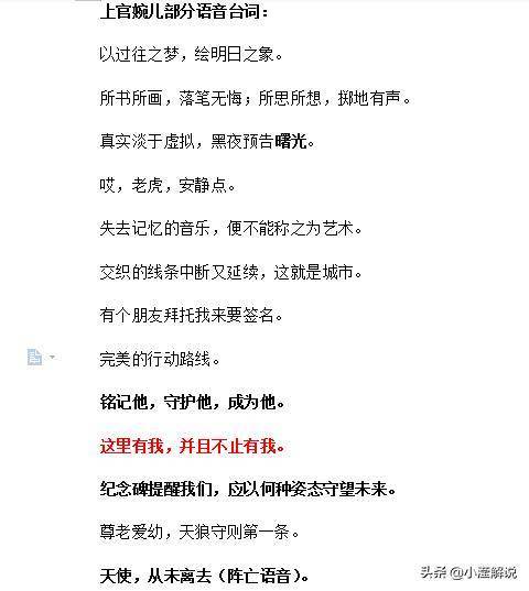 那么这其中到底有什么隐藏的故事呢?原来,KPL天狼系列的背景故事和铠的曙光守护者背景故事是属于同一个世界观,而且天狼这一代的皮肤是由铠拯救下来的而且还继承了铠的意志,从简单的层次来说就是天狼是铠之后几十年甚至更远创立的,而且天狼系列都有着铠的意志并且尊重着,下面就是上官婉儿的部分台词!