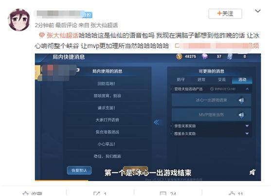 根据网友们提前曝光出的游戏截图来看,张大仙版语音包起码包含两条语音,分别是“冰心一出游戏结束”以及“MVP理所当然”。前者是喜欢出冰心的张大仙的经典老梗之一,后者则是张大仙在游戏获胜之后的口头禅。带着这样的语音包打游戏,绝对会给使用者增加好几倍的回头率。
